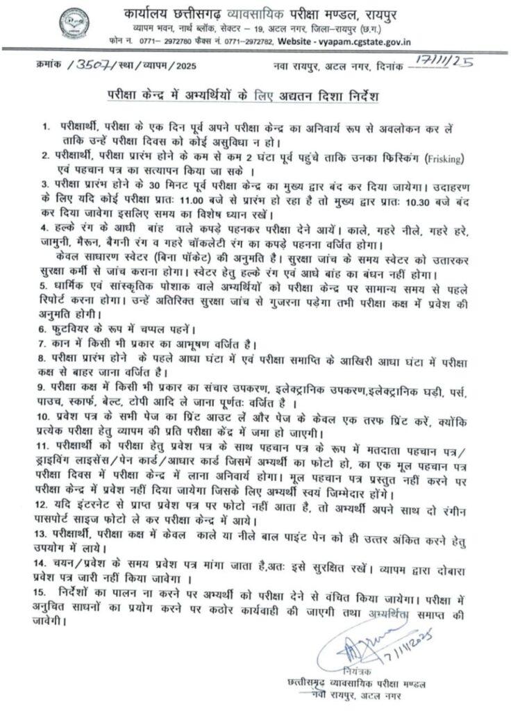 छत्तीसगढ़ व्यापम द्वारा जारी नए निर्देशों के अनुसार सभी अभ्यर्थियों को परीक्षा दिवस पर निम्न निर्देशों का कड़ाई से पालन करना अनिवार्य है। यह निर्देश परीक्षा केंद्र में प्रवेश, सुरक्षा जांच, ड्रेस कोड, प्रतिबंधित सामग्री और समय सीमा से संबंधित हैं।